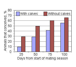 The intervals from the start of the mating season to first heat and to conception were longer for cows with calves (Table 1). .
