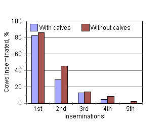 Figure 4: Effect of presence of the calf on birth rates for successive inseminations. SE±3.9; P=0.12 for birth rate following the 2nd insemination. |