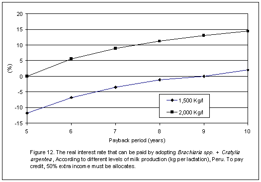 Peru has the highest real interest rate of the three countries, with a real interest of 34% (44% nominal; 10% annual inflation). Even if the investment in these forage alternatives was economically superior, the real interest rate in Peru is so high that farmers would not have the option of intensifying production. They would not be able to pay the 34% real interest in any scenario (not even if cow productivity were 2,000 kg per lactation or terms of payment were over 10 years). In the best of cases, the highest real interest rate which could be paid was 15%.