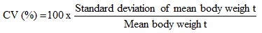 During the experiment, leftover feed and wastes were removed twice a day in the morning (6 30 h) and in the evening (16 00h). Dead fish in each tank were recorded and the tanks were uniformly aerated. Water temperature, dissolved oxygen (Oxy meter model WTW OXI 330) and pH (pH meter model WTW pH 330) were measured daily at 6 00 h. Water quality as phosphor, nitrate-nitrogen and nitrite-nitrogen were estimated weekly by the spectrometric method. At weekly intervals, 30 larvae were randomly sampled in each tank, weighted, and the total length was measured individually; daily food ration requirement was adjusted. After 28 days of rearing, all surviving larvae were collected, weighted, and counted from each tank and individual total length and body weight were recorded. The survival rate (SR), specific growth rate (SGR), body weight variation coefficient (CV), mean daily weight gain (MDWG), condition factor (K), and apparent food conversion ratio (AFCR) was calculated as follows: