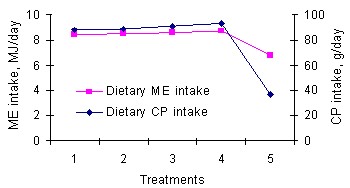 The digestive physiology of ruminants requires that dietary CP intake is synchronised with ME intake to promote efficient microbial and maternal cellular function since microbial protein synthesis is an energy-demanding process and a high or low CP intake is usually expected to induce a similar trend of ME intake (Matenga and Madsen 1992). Even though Lippert et al (1983) had earlier concluded that protein was more important than ME in alleviating the adverse effects of under nutrition during mid gestation on lamb birth weight, dietary CP intake in mid gestation for ewes in T2 ( 43.94 g/d) was lower than T1(64.8 g/d), T3(66.4 g/d) and T4 (61.0 g/d) (P<0.05) and similar to T5 (43.9 g/d) (P<0.05) yet they dropped lambs whose birth weight was similar to T1, T3 and T4 but higher than T5 (P>0.05). This is probably because microbial protein, which is a major source of protein for ruminants, is greatly influenced by energy intake than by protein intake (Robinson et al 1999) because supplemental protein sources contribute only a small proportion of the total dietary CP that escapes ruminal fermentation(Schloesser et al 1993) and may become a limiting factor for production only when ruminal amino acid supply is insufficient to meet metabolic amino acid requirements for maintenance and growth. Other findings similarly suggest that restriction of protein supplementation has no effect on lamb birth weight except when such restrictions are imposed throughout pregnancy or are chronic in nature (O`Doherty and Crosby 1998).