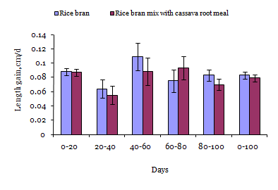 The growth response of Tilapia fish (Oreochromis niloticus) to supplementation with fresh or dried leaves of a sweet variety of cassava was studied in 1 m deep ponds (each 4 m * 2.5 m * 1 m). Rice bran or rice bran mixed with cassava root meal was provided as the energy source (20-24% of feed DM), the mixed feed being given at the rate of 5% of fish LW. There were 30 fish per pond with average initial weight of 6 g per head. The treatments were arranged as a 2*2 factorial in a Completely Randomized Design (CRD) with 4 replicates. The first factor was cassava leaf processing (sun-dried or fresh); the second factor was energy source (rice bran or rice bran mixed with cassava root meal). The cassava leaves and roots were from a local “sweet” variety traditionally planted by farmers for human consumption. The experiment was conducted for 100 days.