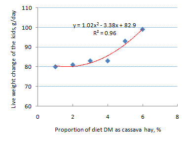 Relationship between rate of live weight gain of the kids and the proportion of diet DM as cassava hay in the diet of the does |