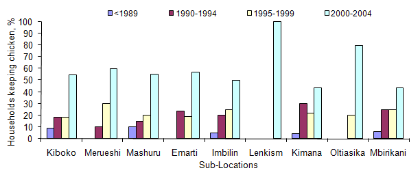 In all the Sub-locations, less than 10% of the respondents had started keeping chicken by end of 1989 (Figure 1).