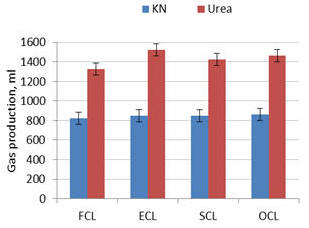 Two experiments were carried out to study effects of processing of cassava leaves on the solubility of the protein and on methane production when they were incubated with cassava root meal in an in vitro incubation with urea or potassium nitrate as source of NPN.