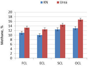 Figure 4. Effect of NPN source on methane per cent  in the gas for 12h incubation  time with fresh, ensiled,  sun-dried and oven-dried cassava leaves Figure 5. Effect of NPN source on methane per cent  in the gas for 24h incubation  time with fresh, ensiled,  sun-dried and oven-dried cassava leaves