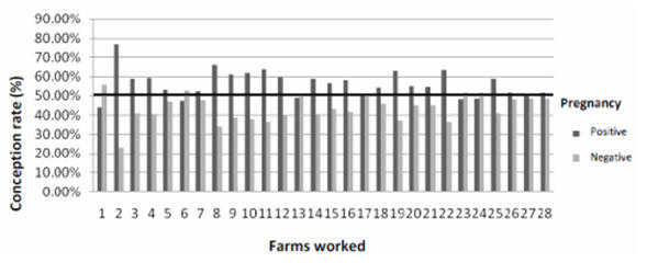 This study evaluated n=28 farm management and found significant differences between groups (P <0.0001). In the farm # 2 and # 1 it was found the highest and lowest CRs 77.0% and 44.1%, as shown in Figure 2. On this concern it can be speculated that such differences were due the fact that each farm have its own peculiarities and differences in soil quality, management, manpower, semen, and grazing animals.