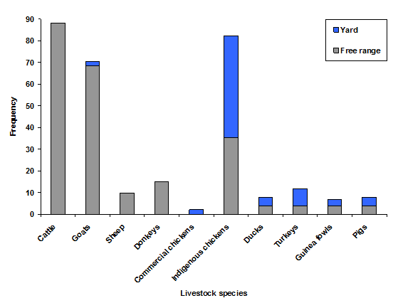 The data were analysed using the Statistical Package for the Social Sciences (SPSS) version 16. Farmers kept a variety of livestock species of which most were indigenous breeds. Chickens were the most common species kept. Although cattle were the second most common species kept, they were more important than all other species in the livelihoods of farmers due to their various roles. Free range extensive production system was the dominant practice. Among challenges faced by farmers the most critical were disease problems, feed and water shortages and inadequate extension service. There were opportunities for improving livestock production in the area including demonstrations on the implementation of proven technologies, augmented by improved extension service provision, deployment of resources and dedicated monitoring systems.