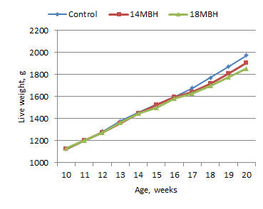 A maize-rice bran meal basal containing 2700 kcal of ME/kg was fed as control. The second dietary treament contained 14% MBH, resulting in an energy level of 2600 kcal of ME/kg. The third treament was formed by including 18% MBH in the control diet, to give 2500 kcal of ME/kg. ME:CP ratio of 131 was maintained in all diets.