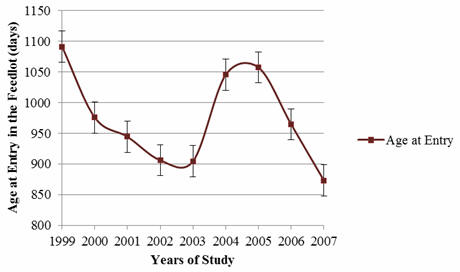 The average age at entry in the feedlot was 31.8 ± 3.89 months, with variations over the study period. Table 2 presents the average age at entry during the study, between 1999 and 2007.