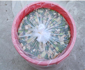 Pseudo-stems were collected from banana plants on farms near the University at the time of fruit harvest. Taro petioles and leaves were harvested from plants growing on roadsides and other unused areas. These materials were chopped finely (1-2 cm) with a knife (Photo 4), sun-dried for 6-8 h to reduce the moisture to 75-80%, and packed tightly into plastic bags (2 liters capacity) which were placed inside rigid plastic containers. The bags were covered with plastic sheet and stored at room temperature (Photo 5).