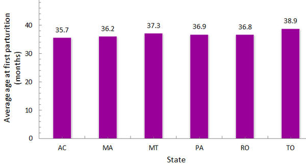 Figure 3. Average age at first parturition in Nellore cows raised in the states that comprise the Legal Amazon. |