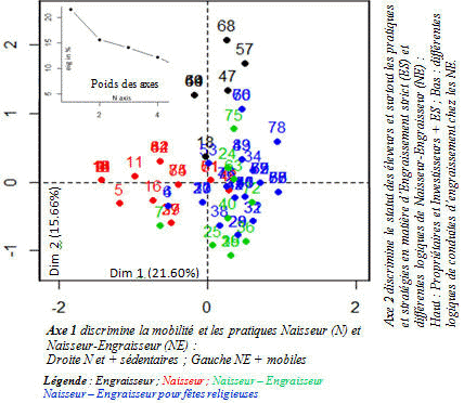 Projection ACM axes 1 & 2 des élevages selon leurs pratiques : Naisseur / Naisseur-Engraisseur / Engraisseur/Naisseur-engraisseurs pour fêtes réligieuses |