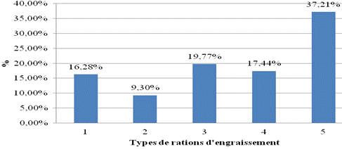 Cette situation concernant l’utilisation de l’orge s’explique par son prix élevé mais surtout par sa disponibilité irrégulière sur les marchés d’aliments de bétail. En outre, un changement brusque du régime alimentaire des animaux peut provoquer la mortalité des animaux [7] notamment chez les jeunes agneaux. Si l’on regarde de plus près, la figure 5 montre que la ration 5 (orge, blé tendre, son) constituée par le régime alimentaire composé d’orge en grain, blé tendre et son, apparait comme étant la ration dominante, soit 37,21 %.