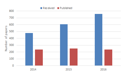 It is not possible to compute a true annual rejection rate as papers submitted towards the end of a year may not be reviewed until the following year. On the basis of the papers received and published over the past three years (Figure 1) the average acceptance rate has fallen from 49% in 2014, to 41% in 2015 and 31% in 2016. This decline in the acceptance rate is because the number of papers submitted has increased steadily from 480 in 2014, to 607 in 2015 and to 758 in 2016. The editorial capacity of LRRD, which is managed on a voluntary basis, is of the order of 240 papers processed per year (20 per month), thus we had to raise the bar on the criteria for acceptance. This has been done by not accepting for processing (in the majority of cases but with some exceptions depending on circumstances) papers that are based only on surveys.