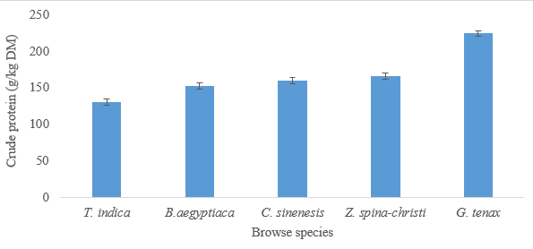 The proximate composition of the browse species and hay is presented in Table 1. There were considerable variation in browse proximate composition except DM. The CP, tannins (CT, PHE), and ether extract contents are presented in figure 2, 3 and 4, respectively in ascending order. Among the browse species, G. tenax had the highest CP while the lowest were recorded in T. indica. C. sinensis had the highest NDF and ADF contents while B. aegyptiaca and G. tenax had the lowest NDF and ADF contents, respectively. T. indica was observed to be the highest in condensed tannin and total extractable phenolics ((≥60g/kg).