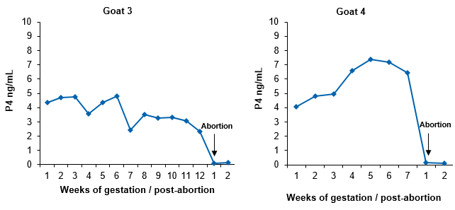 Progesterone levels declined sharply in G1 and G3 3 and 6 weeks prior to abortion, respectively. Moreover, their average P4 concentration was lower than that in goats experiencing normal pregnancy. Thus, malfunctioning corpus luteum can be considered to be one of the causes of abortion.