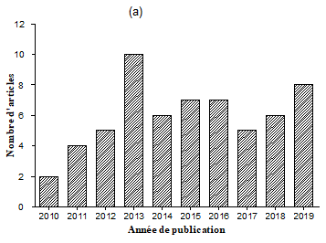 | Figure 1. Nombre d’article publiés de 2010 à 2019 (a) et affiliation de l’auteur principal (b) |