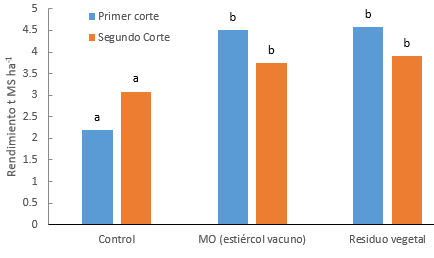 | Figura 2. Rendimiento t MS ha-2 corte-1 en siembras por semilla gámica en la fase de establecimiento |