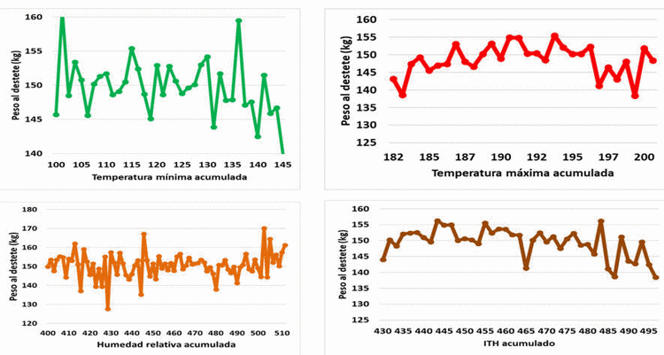 Este indicador se estimó para x =temperatura máxima; temperatura mínima; humedad relativa e ITH, es decir cuatro formas diferentes de expresar la carga calórica y con estos resultados se creó la base de datos PD clima. Se conformó la combinación año de destete-mes de destete en los conjuntos PD pesos y PD clima, las cuales fueron unidas creándose la base de datos PD fin que fueron finalmente los registros analizados.