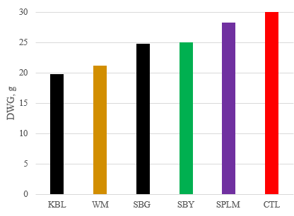The diets with SBG (32% replacement) and SPLM (32% replacement) gave only minor differences in weight gain compared with the control. SBG was moderately rich in CP (23.4 ± 0.2), CL 9.4, and cellulose 51 ± 0.7 and also contains other nutrients (Yu et al 2020). The CL content in our study was higher than the 66 g kg-1 DM reported by Nhi et al (2018), and much higher than the 39 g kg-1 DM reported for oven-dried SBG by Santos et al. (2003). Elevated dietary lipid content above the minimum required level can support higher growth rates, partly due to protein-saving effects (NRC 2011). Our values were within the optimum range (5-12% lipid) reported for tilapia diets (Lim et al 2011). However, higher dietary lipid content may increase flesh lipid levels in freshwater fish (Guo et al 2019).