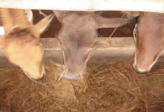 | Photo 1. Rice straw was added with urea, packed into polyethylene bags and offered for growing crossbred Sind cattle | |